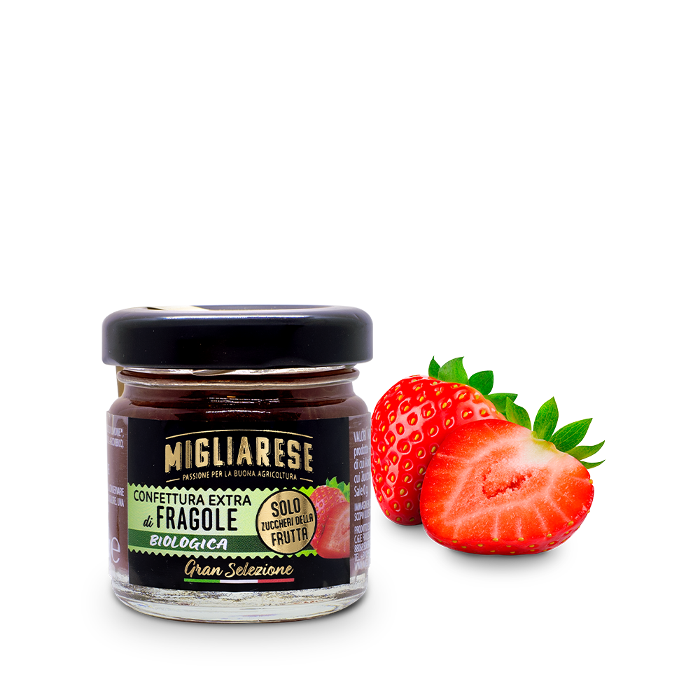 Fragole*, zucchero d’uva*, acqua, succo di limone*, gelificante: pectina da frutta, antiossidante: acido L-ascorbico, stabilizzante: citrato di calcio. *Biologico